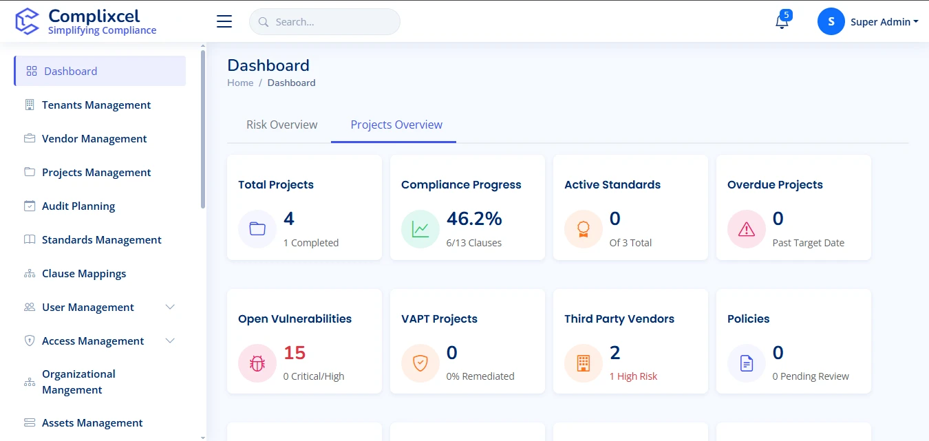 Cloud-based compliance and risk management built to centralize projects, clauses, assets, vendors, and reporting.
